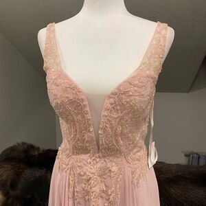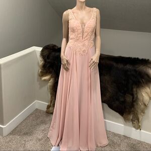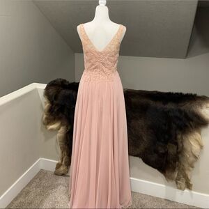 Romantic and charming evening dress. Delicately beaded with matte sequin forming flowers all over the upper body. The fitted bodice is a lovely complement to the flowing chiffon fabric.