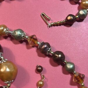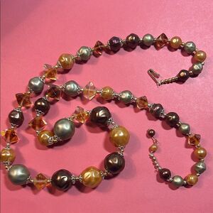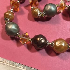 This elegant necklace features a stunning array of multicolor beads, perfect for adding a touch of sophistication to any outfit. The combination of gold, silver, and brown tones creates a versatile piece that complements any style. Approximately 15”. G359