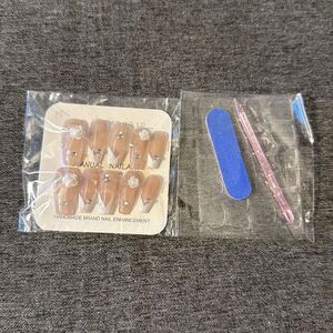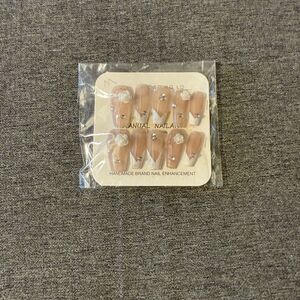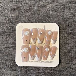 New, Stylish nude press-on nails featuring pearl and rhinestone accents. Perfect for a chic look.