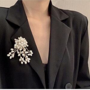 Add a touch of elegance to your wardrobe with this stunning vintage-inspired floral brooch. This exquisite accessory showcases an intricate arrangement of pearly beads, resembling delicate buds blooming from a central cluster. The design mimics the beauty of nature, with branches that cascade gracefully, creating a dynamic yet refined look. Each pearl bead is carefully attached to gold-tone stems, adding a luxurious feel and a subtle sparkle that catches the light beautifully.