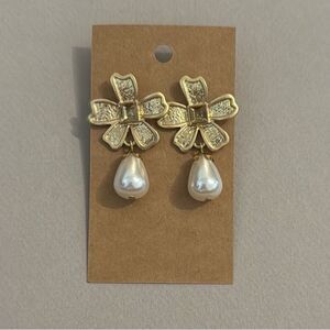 These elegant earrings feature a beautiful gold flower design with a lustrous pearl drop. Perfect for adding a touch of sophistication to any outfit.