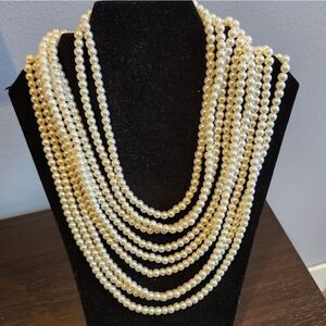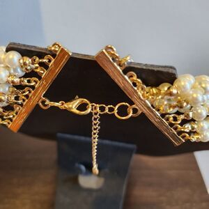 This stunning nine string pearl necklace features an elegant Chanel accent pin which is removable. Perfect for adding a touch of sophistication to any outfit with or without the pin.