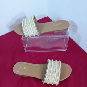 Step into elegance with these pearl-embellished slide sandals. Perfect for adding a touch of sophistication to any outfit. The tan color complements a variety of styles.