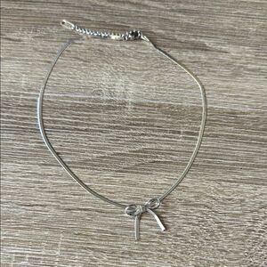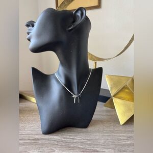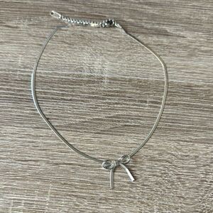 This elegant silver bow necklace adds a touch of sophistication to any outfit. Perfect for any occasion.