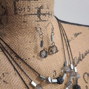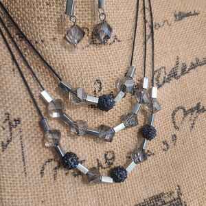 Elegant Silver and Black Beaded Jewelry Set With Necklace & Earrings