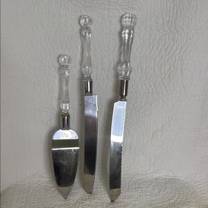 Stylish serving set with silver blades and clear handles. Perfect for special occasions.