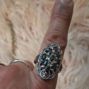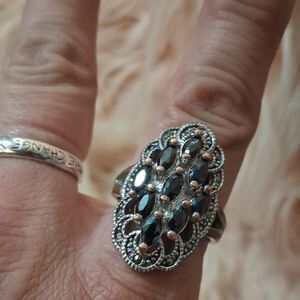This stunning women's ring features a sophisticated design with black stones set in a silver band. Perfect for adding a touch of elegance to any outfit.Silvertone alloy not sterling silver***
