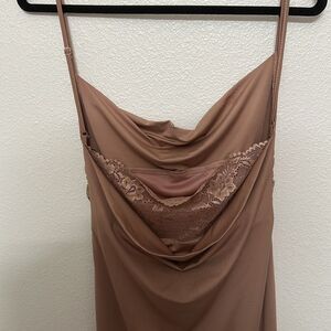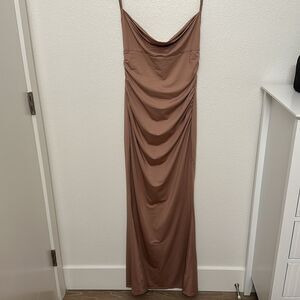 Stylish tan maxi dress with a flattering fit. Perfect for evening events.