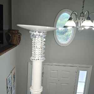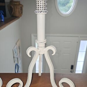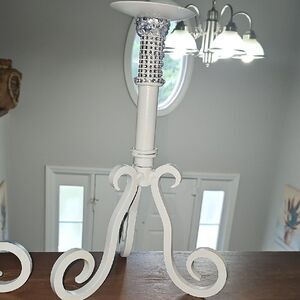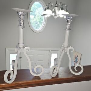 Set of two elegant white candle holders with decorative accents. Perfect for adding a touch of sophistication to any room. Perfect for a bridal table or formal event