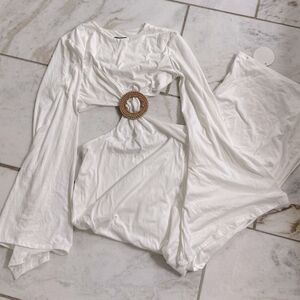 This elegant white maxi dress features stylish cut-out details and a chic beachy ring accent. Perfect for any special occasion.
