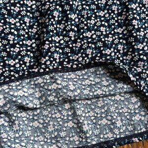 This is a very lightweight, extremely comfortable and cute floral midi skirt from the sustainable clothing brand Elegantees. The background color is navy, and the pattern has delicate lilac and cream flowers on it. It's feminine and perfect for summers in a hot climate. Looks cute with a tee, can be dressed up or down. It's got a comfy elastic waist and measures 17 and 1/2 inches across the waist when lying flat, and 21 inches long.