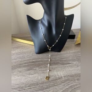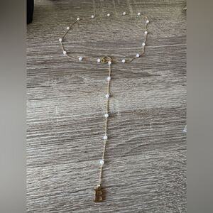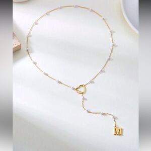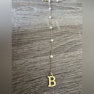 This elegant necklace features a delicate gold chain adorned with lustrous white pearls. Letter B Perfect for adding a touch of sophistication to any outfit. 18k gold plated hardware
