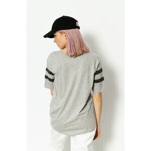 • Other information: Gray heathered t-shirt with black text / images. Rounded neckline. Short sleeves (on the long side) with black stripe accents.