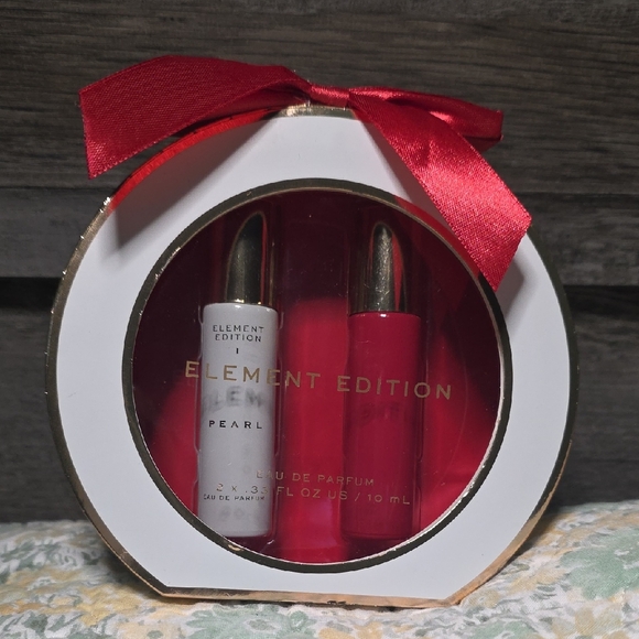 Elegant Element Edition perfume set. Includes two bottles. Adorned with a red ribbon.