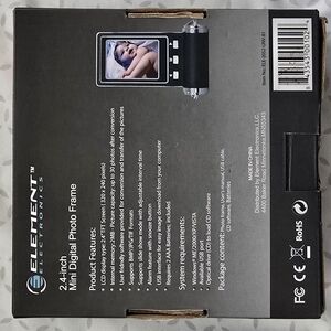 Element Electronics digital photo frame. Sleek black and silver design. Holds up to 30 photos.