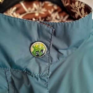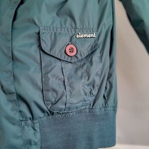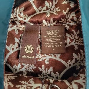 Element zip-up bomber jacket. Pretty forest green color with satin brown interior featuring a nature scene. In excellent condition.