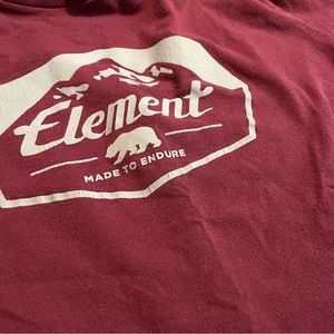 Graphic maroon short sleeve cotton tee by Element. Preowned in good condition. Tee features graphic design on front, crew-neckline, regular fit, and short sleeves. Size S 100% Cotton