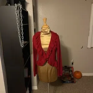 Stylish red jacket with ruffled design. Perfect for layering.