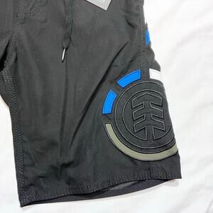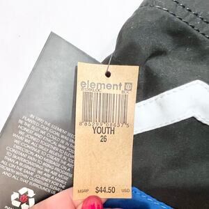 Introducing Element Shorts for kids in youth size 26, featuring a mix of black with white, blue, and gray colors. These swimwear trunks are made from durable polyester material, designed for comfort and performance. This item is brand new.
