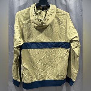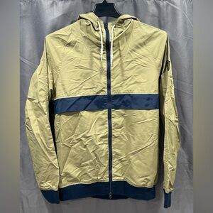 Stylish khaki windbreaker with navy stripe. Perfect for outdoor activities.