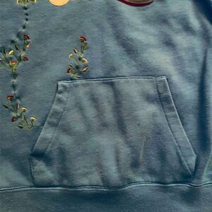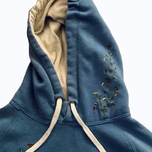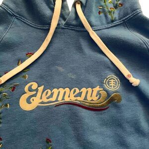 Cute blue pullover sweatshirt. Drawstring hoodie. Hoodie is lined. Kangaroo front pocket. Thumb holes at cuffs. Floral embroidery on front & back with Element logo front chest & lower back. Small discoloration on front chest and small pinhole on front pocket. Please see last 2 photos for details otherwise in good preowned condition. Element Size XS