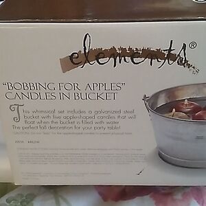 Pre-owned in good unused condition. The set Includes one steel galvanized buck with handles and five apple shaped candles that will float when the bucket is filled with water.1999. Comes with original packaging.