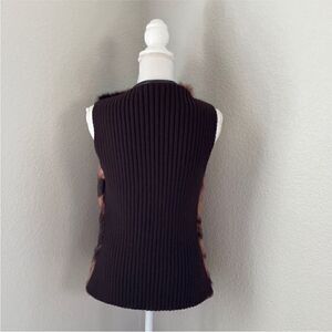 Elements by Vakko Rabbit Fur Vest. Brown in color. Tear in seam at the top of the shoulder. Can still wear it. Looks like easy repair by a seamstress. No size tag. Fits like a Small/Medium. Please see measurements for accurate sizing.
