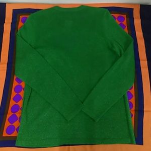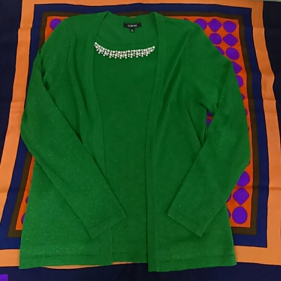 Very Classy! Sewn in faux pearl and rhinestone neckline with the illusion of a top and jacket all in one top! Green shimmer material make this top perfect for the holidays!