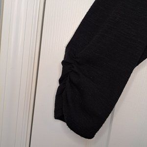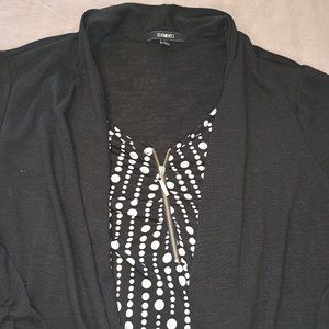 Very cute, layered-look blouse from Elementz brand. The "shirt" is white and black polka dots with a zipper accent at the neck, and attached cardigan is solid black with elastic/scrunched accents at the cuffs. Very soft. A cute, easy look for the office! Size Large; measures about 22.5 inches between the pits, 17 inches long and 19 inch sleeves.