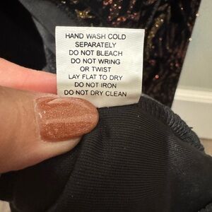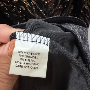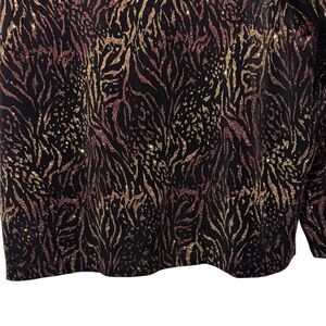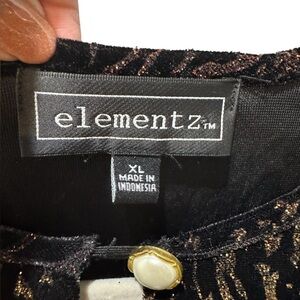 Beautiful Elementz metallic glitter print jacket with an attached black velvet cami — a perfect two-in-one piece for holiday parties, dinners, or any elegant winter event. The jacket features a subtle animal-inspired metallic pattern that catches the light beautifully.