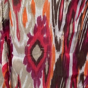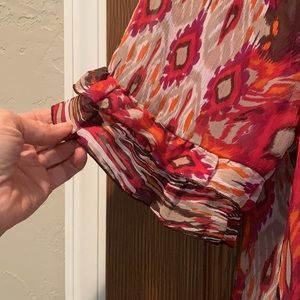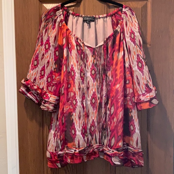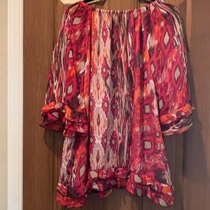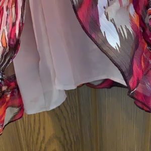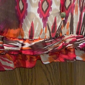 Lined top with Sheer sleeves with ruffles. Tie at top. Elastic at neck. Shoulders to hem is 27 inches. Last pictures shows some snags on front. Priced accordingly.