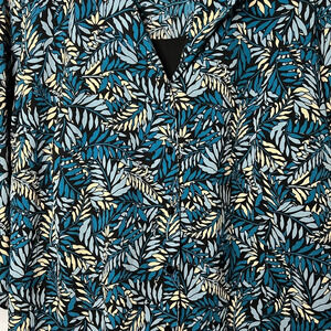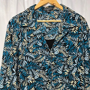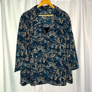 Elementz Woman fern print button down mock-layer 3/4 sleeve blouse. Black with grey-blue, tan and teal. Under layer cami is only under the front of the blouse, just the fern print is on the back. Size 3X. In excellent preowned condition!