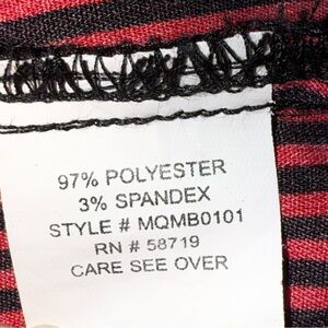 Bold red shirt with black stripes. Button-down style. Ideal for casual wear. Polyester spandex blend. This shirt is super has buttons and tabs on sleeves to roll up. Soft machine washable size Large.
