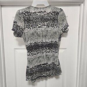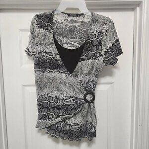 This is an Elementz women's tunic top in size M. It features a cross front design with a built-in tank, short sleeves, a round neckline, and a pullover closure. The color is gray with a snakeskin print, and the fit is regular. This top is suitable for casual occasions and has a comfortable and relaxed fit.