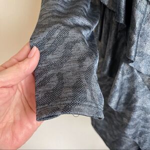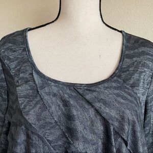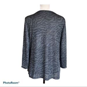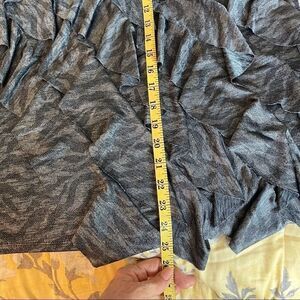 Features: Beautiful smokey blue top with a sheen to it. Sleeves are 3/4 and the neck is scooped. Ruffles down the front of the top. Silky feel to it. Great top for any occation.