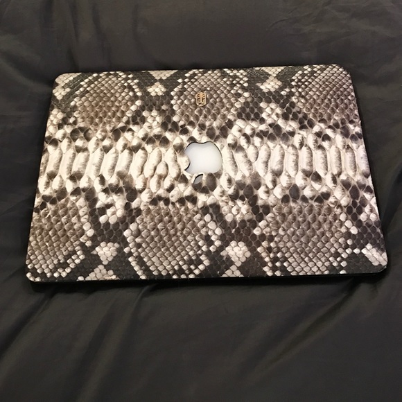 100% real python skin MACBOOK PRO RETINA DISPLAY 13" computer case, with the entire top cover covered with white and brown colored python skin and the bottom covered with a matching grey shell. Have received nothing but compliments with this amazing cover. Bought it 2 months ago, selling it because I bought a new computer (larger one), and will be ordering another one for that one.