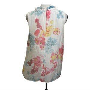 Elena Baldi Silk floral blouse. Ruffle detail around neckline. Keyhole back closure lined. Size medium. Sleeveless summer top. Made in Italy.