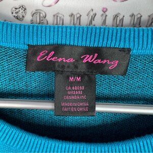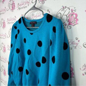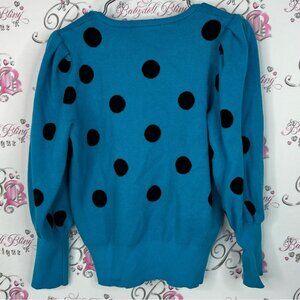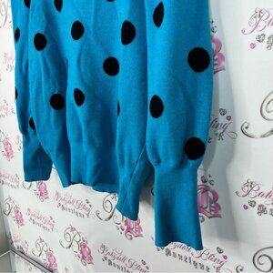 Vibrant teal sweater with bold black polka dots. Stylish crew neck design. M.