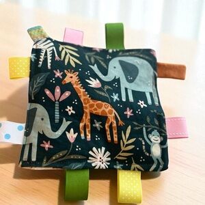 Adorable elephant sensory toy with colorful tags. Features pink, green, blue, yellow, and brown accents.