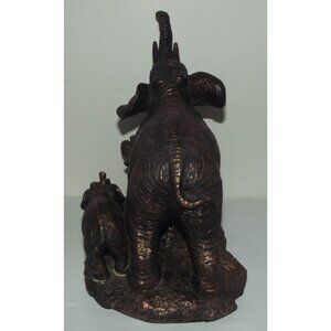 This bronze-colored chalk-ware figurine depicts an elephant family in intricate detail (Mother and.2 babies). Standing 8 inches tall (including trunk)
