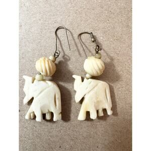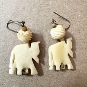 Hand carved ivory elephant earrings, pierced, vintage with carved ivory decorative spiral bead on each earring. Original vintage earring hook has been replaced.