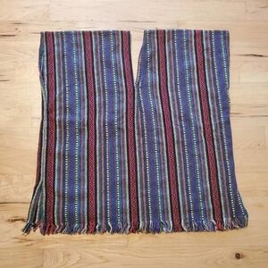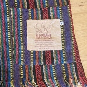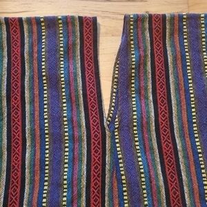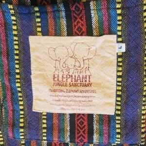 Elephant Jungle Sanctuary Boho Hippie Sarape Style Striped Poncho. Festival, bohemian, hippie peasant with fringed bottom hem. Bright colorful patterns of black, yellow, red, purple, green, blue, orange and white. Unisex, size large, approximately measures flat lay 28" pit to pit, 29" shoulder to hem, front pockets with branded logo patch, slit side's & V-neck. Excellent quality and condition!