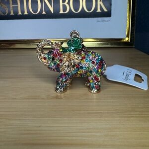 A vibrant elephant bag charm/key chain adorned with multicolored rhinestones. Features a gold base with sparkling accents. So beautiful and new