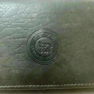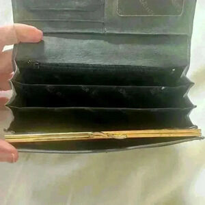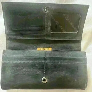 Vintage and classic continental style wallet in gray color leather with gold kiss clasp style hardware. This wallet is in good condition. Does have some signs of wear on the leather and hardware. Pics show wear and include measurements.