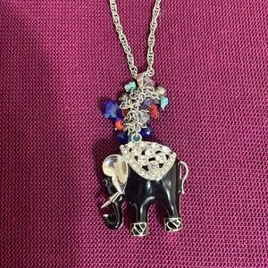 Beautiful silver tone, elephant necklace with small gemstones and glass beads, I will. Elephant is black enamel with rhinestones and the back has cut out hearts see pictures for more details