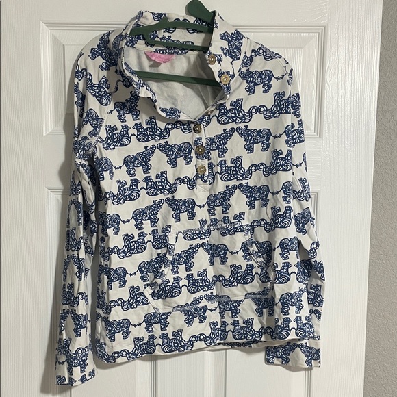 pullover with a blue and white elephant pattern. Features a gold button-up collar.