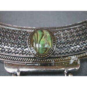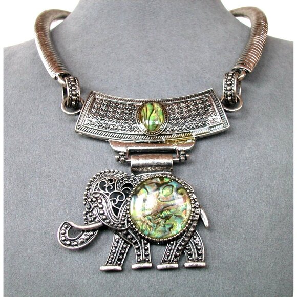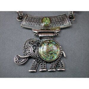 An intricately designed silver-tone elephant pendant choker necklace featuring iridescent acrylic accents. The adjustable chain ensures a secure and comfortable fit.
