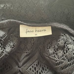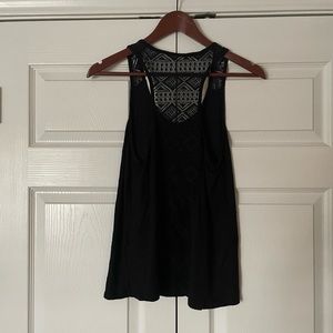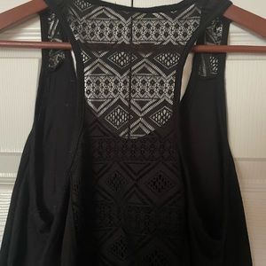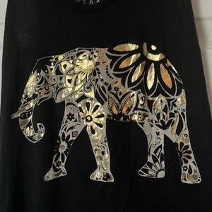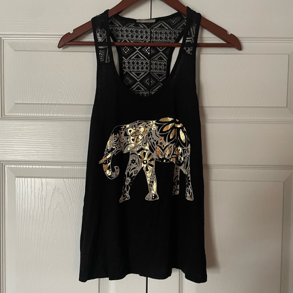 Racerback tank top with elephant design from Free Kisses. Women’s medium. Gold/silver graphic. Lace back and shoulders. In very good used condition. Smoke-free home.