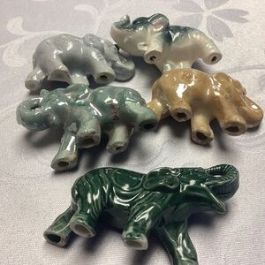 Questions? Leave a comment below! this is a very old bat all of the elephants have their trunks up. I just noticed when I was filming that the deep dark green one did have a repair on it. It’s done quite well. I couldn’t actually notice it. Did he have a little leg that was broken but it’s been repaired and I noted that they’re five in total we have an adorable gray one again trunk up mark Japan. We have an iridescent gold one that’s marked Japan as well trunk than this adorable cute one and the Grays with the pink that’s also the trunk up and then we have an iridescent shimmery mark Japan kind of a pinkish gray all five one price I have noted that the one does have a repair on it so please keep that in mind when you’re getting them these have been stored in the China cabinet for the 1960s. They’re beautiful. quite desirable. Height appropriate 2” length is at approximately 2/5//8