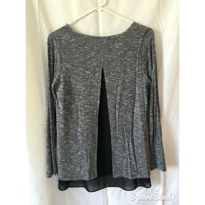 Grey and white patterned long sleeve tee with cute graphic elephant on the front. Opening in the back with black sheer lining attached. Only worn once!